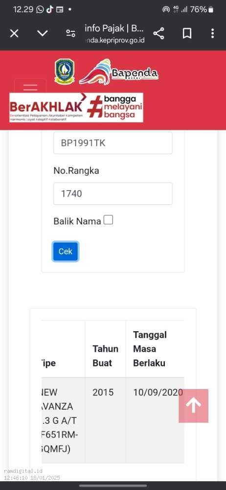 | *Quality Control RAM Showroom* *Hari* : Selasa, 11/02/2025 *NOPOL* : BP 1991 TK Change To BP 1090 EH *JENIS KENDARAAN* : Toyota New Avanza 1.3 G A/T *TAHUN* : 2015 *WARNA* : Silver Metalik *TRANSMISI* : Automatic Transmisi *KILOMETER* : 130.340 KM *KUNCI* : 1 *PAJAK* : 10/09/2025 *FITUR KENDARAAN* : - Dual SRS Airbag - Double Speaker Din - Electric Power Window - Electric Mirror Spion *MINUS* *-* cat body penyok, belang, lecet, kriting, dan clear putus *-* cat dotrim minus pemakaian *-* jok memulau dan berlubang kena api rokok *-* spion kabin minus pemakaian *-* mesin rembes netes *-* mika spido minus lecet nitik *-* antena tidak ada *-* foglam kotor dan tidak ada lampu *-* reflektor kiri bawah belakang pecah sompel *-* tutup tanki wiper variasi *-* talang air minus pemakaian *-* plafon minus noda permanent *-* alarm mobil sensitiv *NYUSUL* *-* |