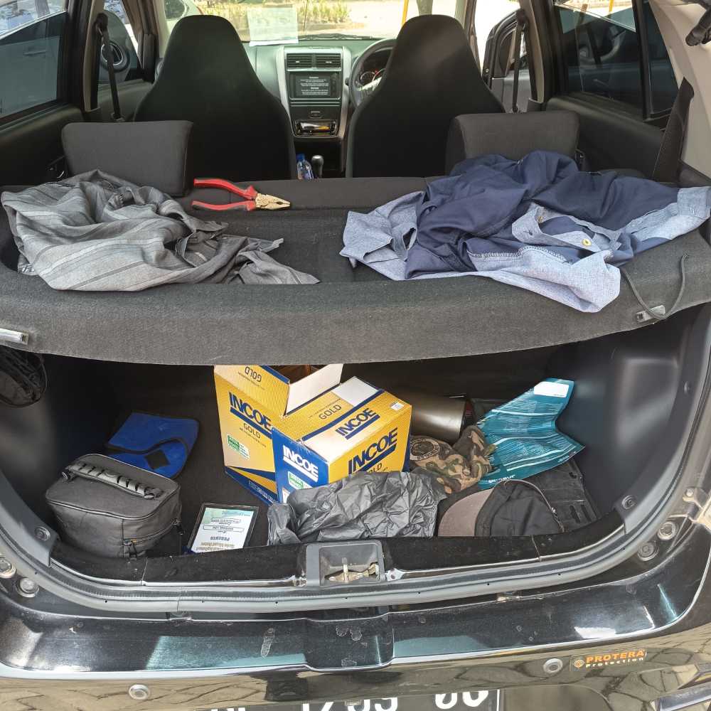 | Fitur Kendaraan * Lampu depan halogen * Velg alloy * Spion elektrik * Head unit layar sentuh (Bluetooth/USB) * AC digital * Power window & power steerng * Dual SRS Airbag * ABS & EBD * Sensor parkir belakang * Mesin 1.2L (±88 PS) * Transmisi manual 5-speed * Irit bahan bakar Catatan Hasil QC Kategori : A -Layak pakai dengan tanda pemakaian wajar Kondisi kendaraan secara umum masih baik, namun terdapat beberapa catatan pemakaian sebagai berikut: * Jok depan*terdapat sobek kecil (bolong halus) * Pijakan kaki mengalami lecet pemakaian, wajar akibat penggunaan sehari-hari. *Lampu foglamp dalam kondisi mati, perlu pengecekan atau * Ruang ban serep terdapat lecet-lecet ringan * Velg mengalami lecet pemakaian di beberapa bagian * |